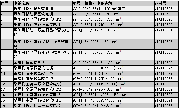 礦用產(chǎn)品安全標(biāo)志證書(shū)目錄(礦用橡套電纜)
